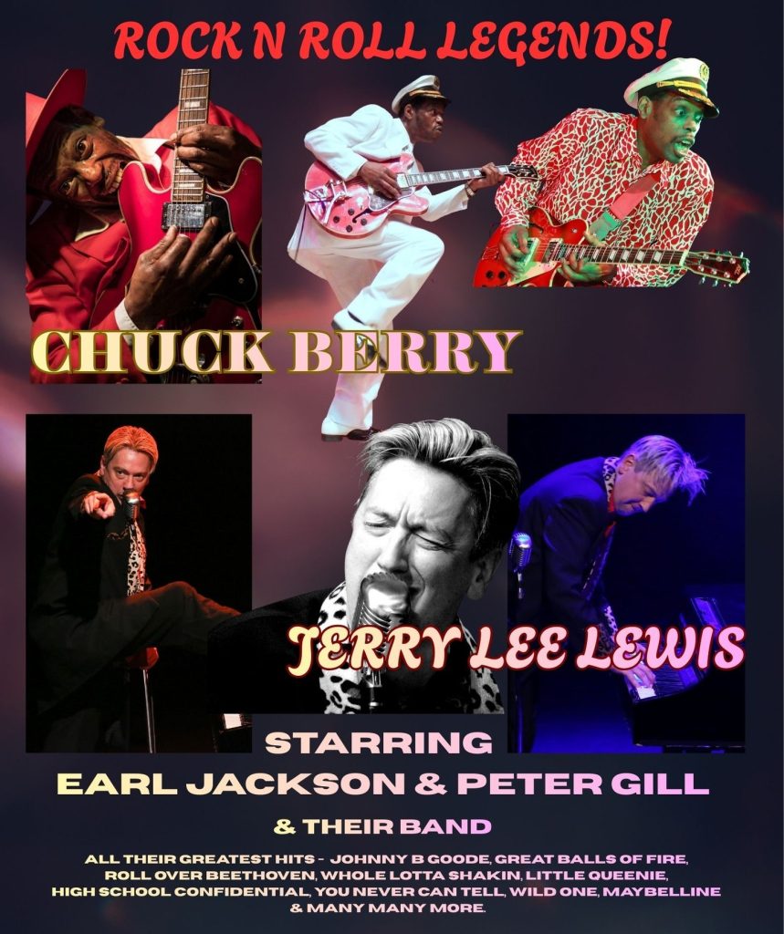 Chuck Berry the Godfather of Rock ‘n’ Roll (as played by the amazing Earl Jackson) and the first ‘Wildman of Rock’ Jerry Lee Lewis (performed by piano maestro Peter Gill), come together with a terrific band in a high octane show packed full of all their greatest hits such as Johnny B Goode, Great Balls Of Fire, Roll Over Beethoven, Whole Lotta Shakin, Little Queenie, High School Confidential, You Never Can Tell, Wild One, Maybelline and many many more.